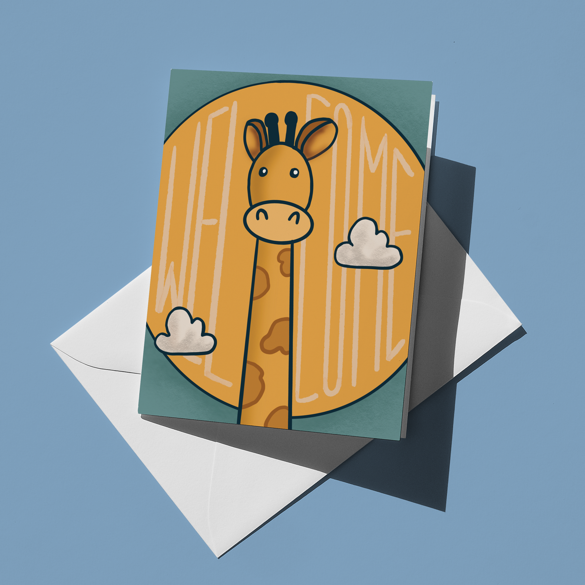 🦒 Design: An illustrated giraffe with “Welcome” scripted into the sun in the background, bringing warmth and joy to the card.